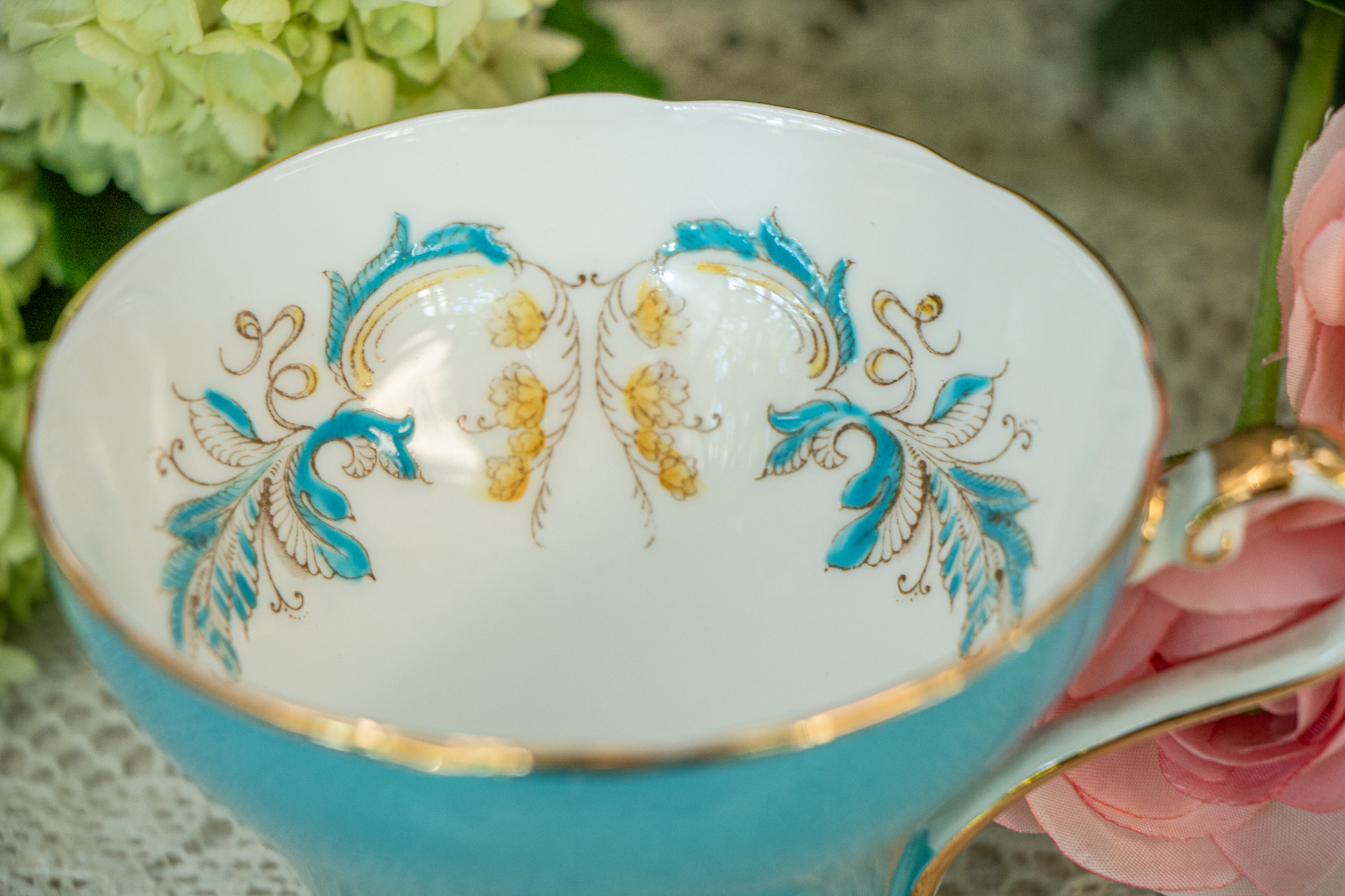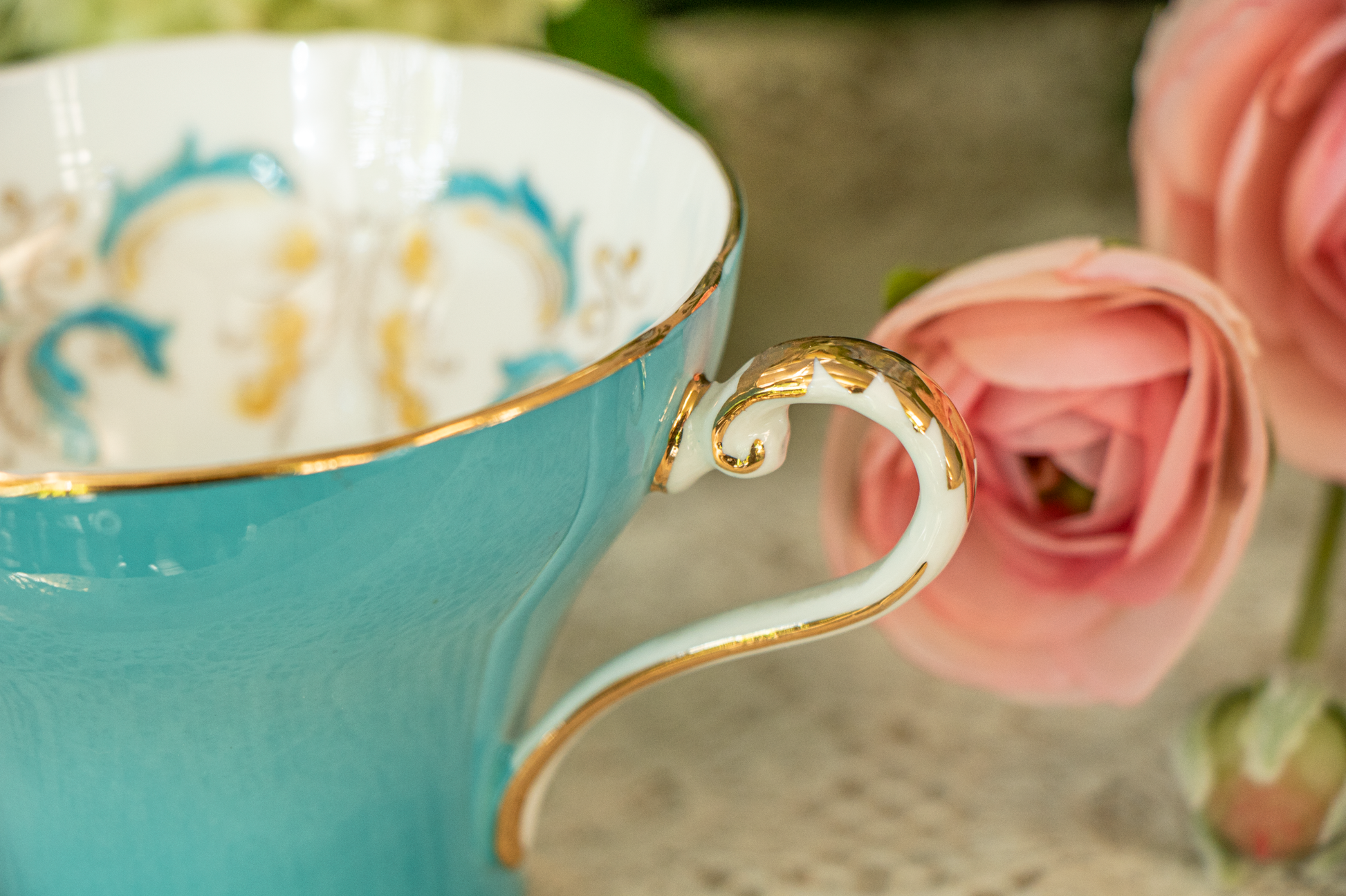 Aynsley Turquoise & Gold Scrollwork Teacup and Saucer — Fine Bone China, Made in England