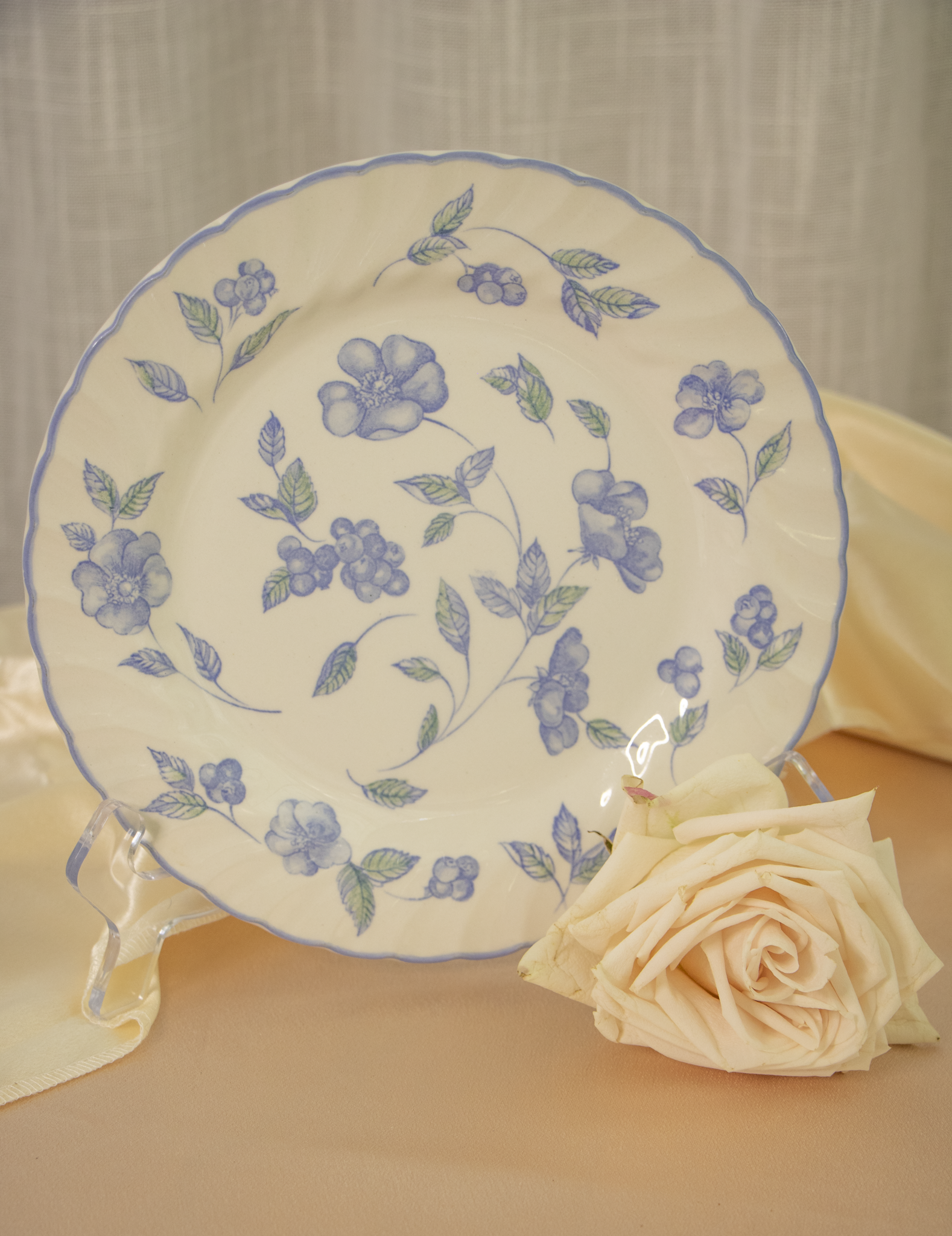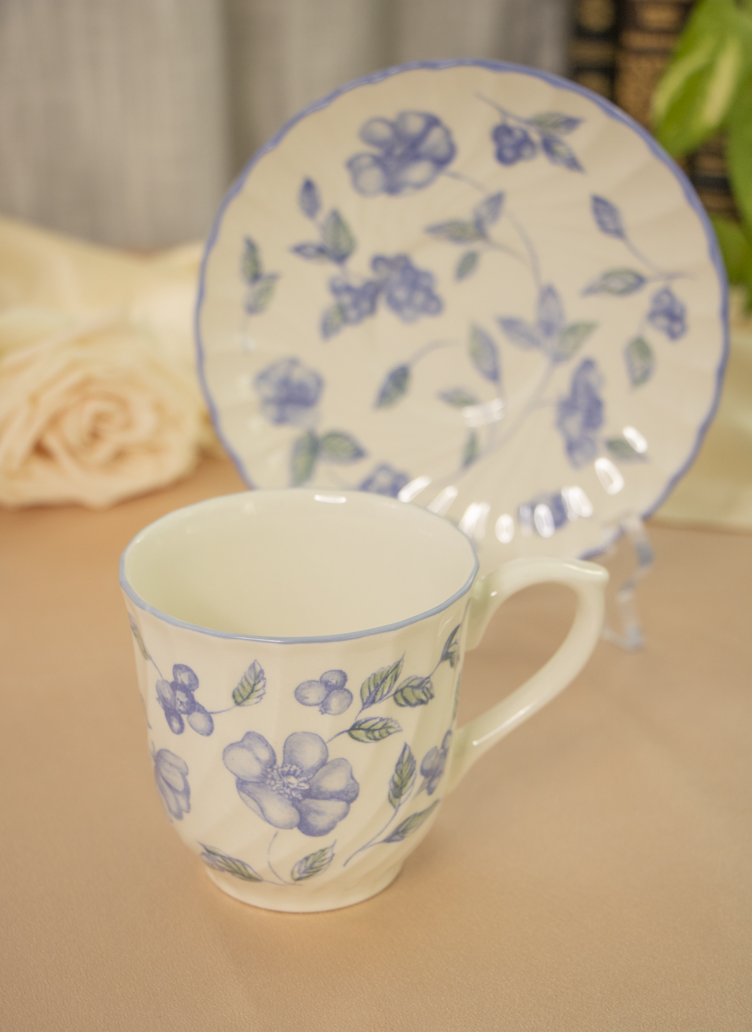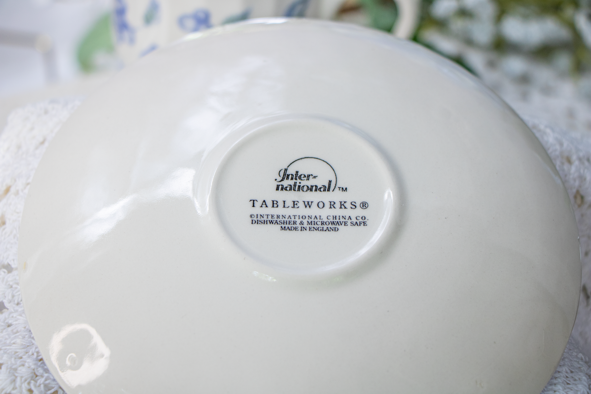 This graceful bundle showcases a teacup, saucer, and dessert plate trio in the timeless Bristol Blue (Blue Trim) pattern by International, made in England. Blue blossoms and ripened fruits entwine across fine china, framed by a delicate swirled border that whispers of English garden charm.