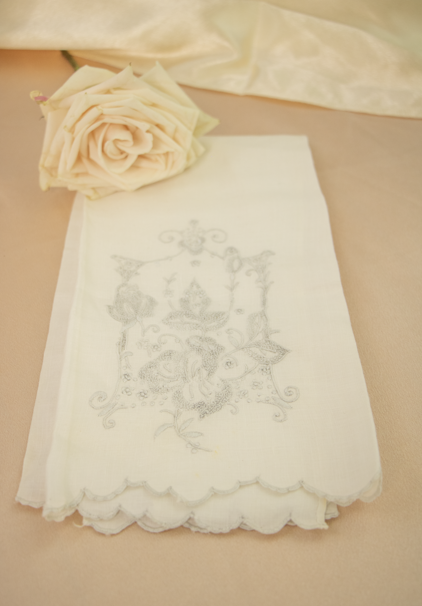 - An elegant linen tea towel, exquisitely embroidered with white-on-white floral and botanical motifs. Scalloped edges and handcrafted detail elevate the piece