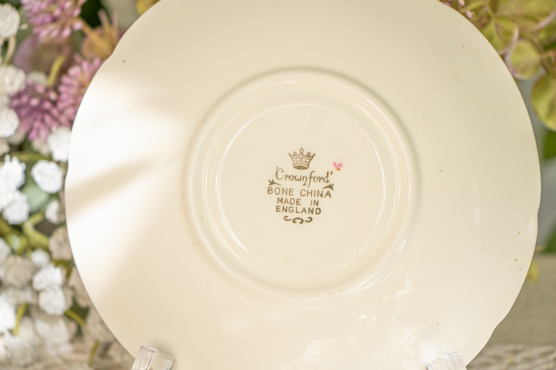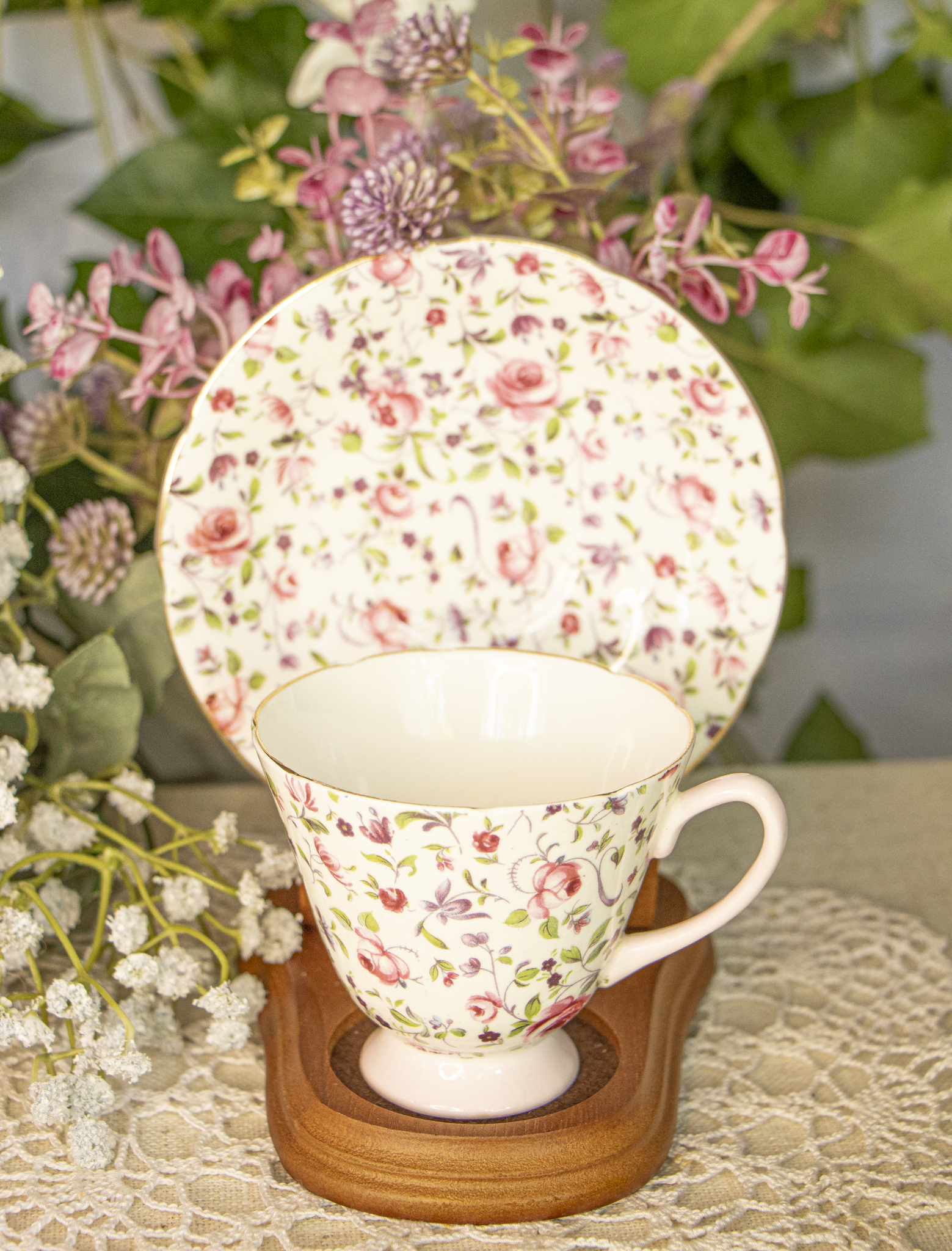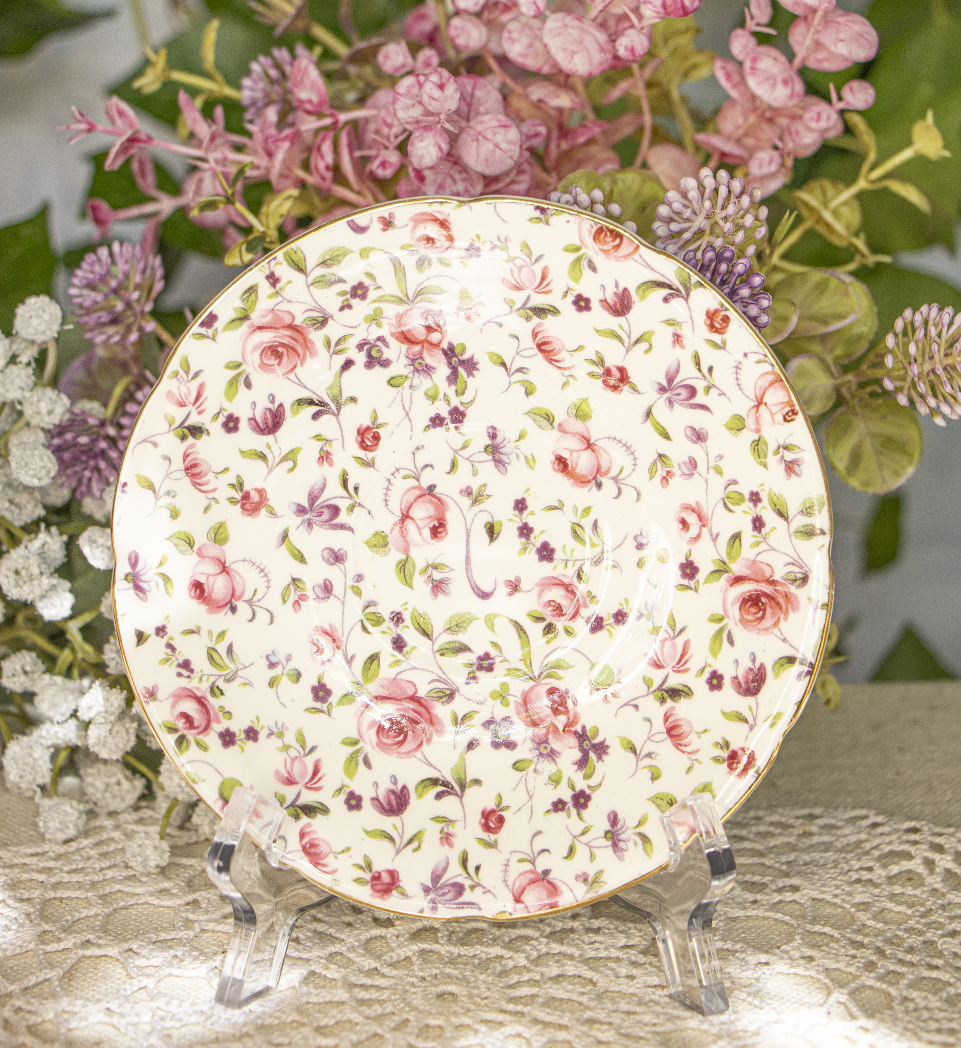 Bring classic English charm to your tea table with this beautiful vintage teacup and saucer set by Crownford China Co. Made of fine bone china in England, this set features an all-over chintz pattern of pink roses, purple florals, and green leaves on a white background, trimmed with elegant gold on gently scalloped edges. The teacup has a soft pink foot and matching handle for extra vintage charm.