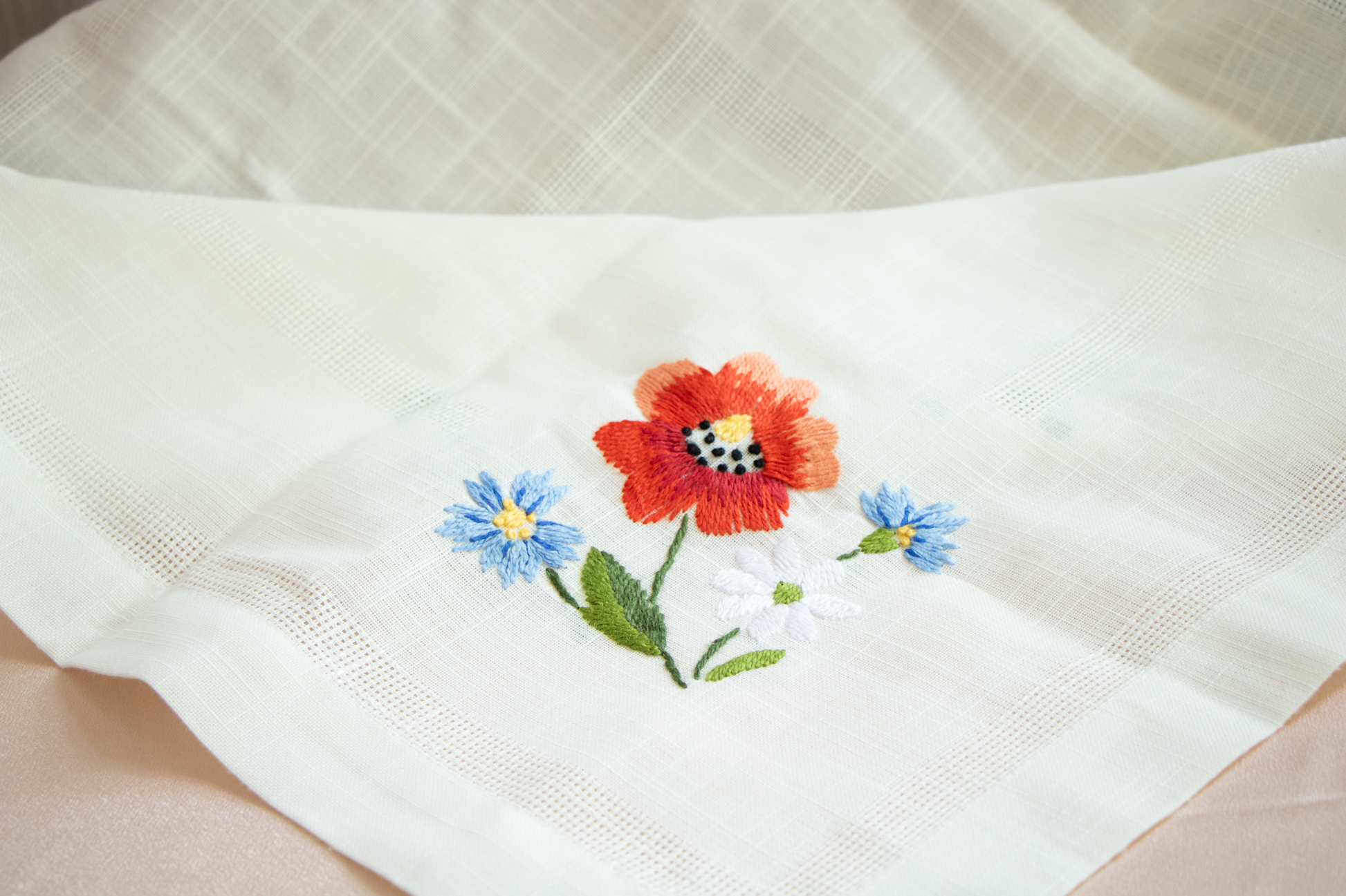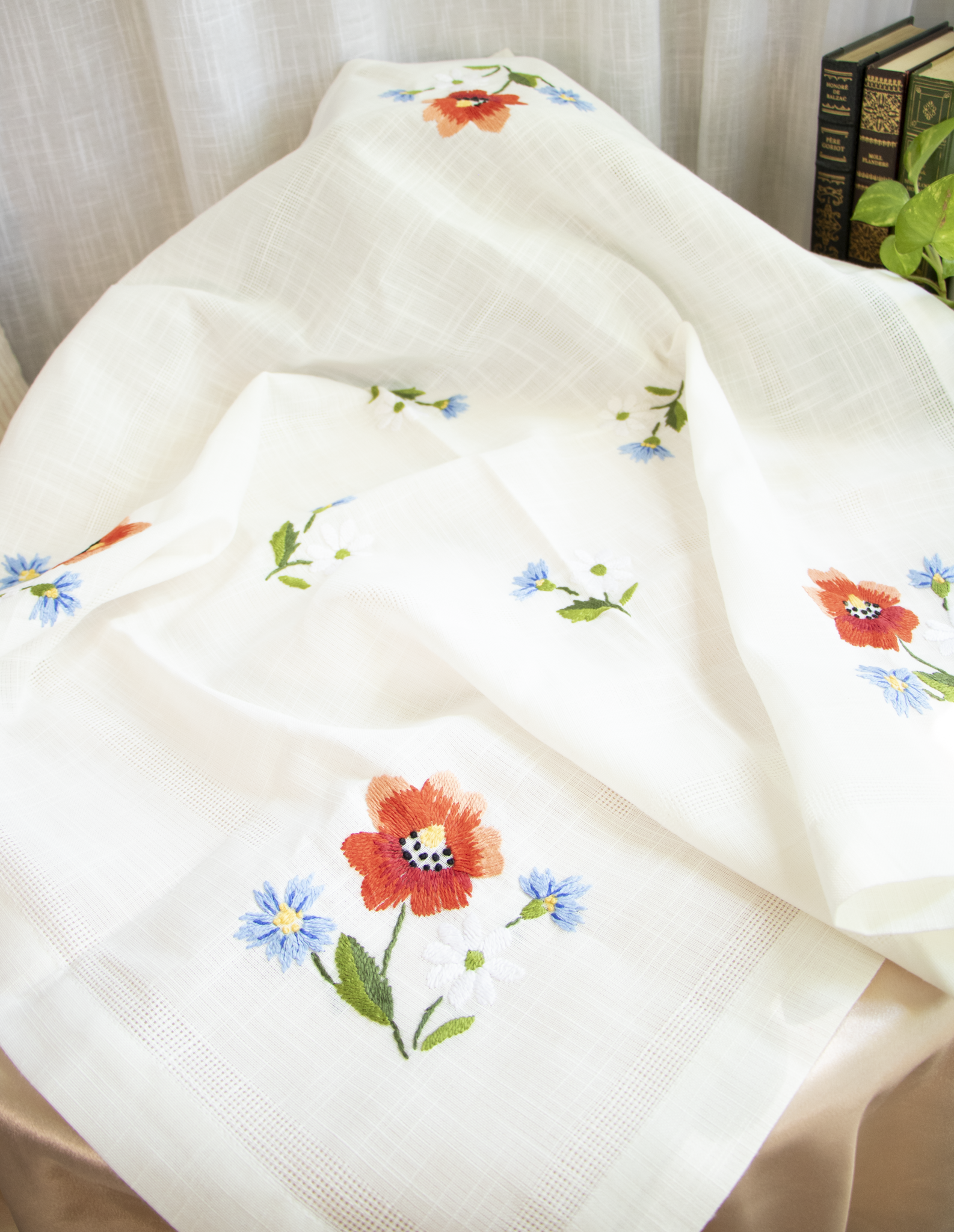 The embroidery depicts large red-orange flowers with black and white centers, accented by smaller blue and white blossoms with green leaves. The florals are placed in balanced groupings, adding color and charm without overwhelming the fabric’s airy feel. A simple drawn-thread border frames the design, giving it a refined, handcrafted look.