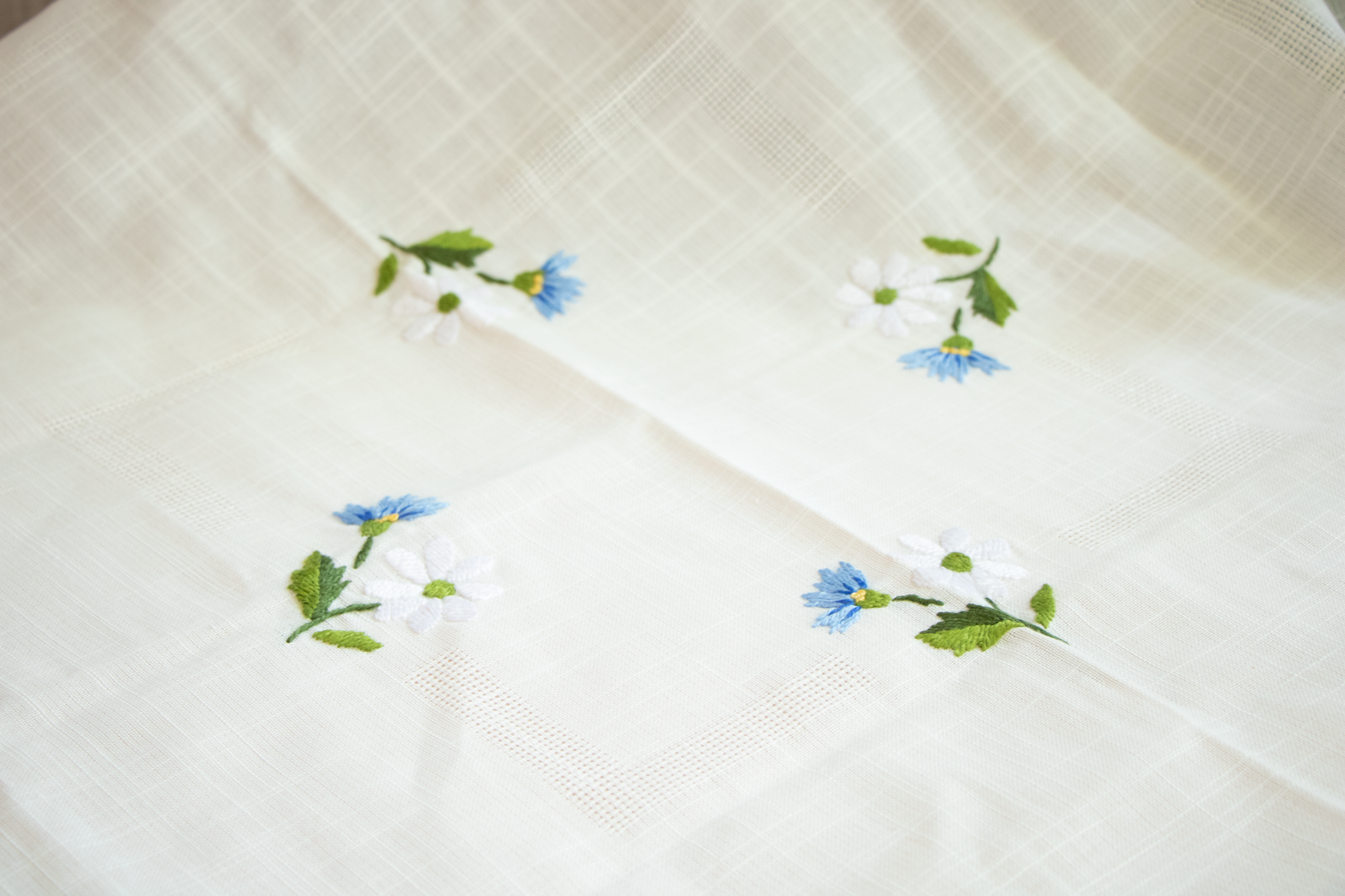 This is a delicate vintage-style tablecloth/topper made of a lightweight, semi-sheer white fabric with a subtle woven grid texture. It features beautifully embroidered floral motifs scattered across the cloth.