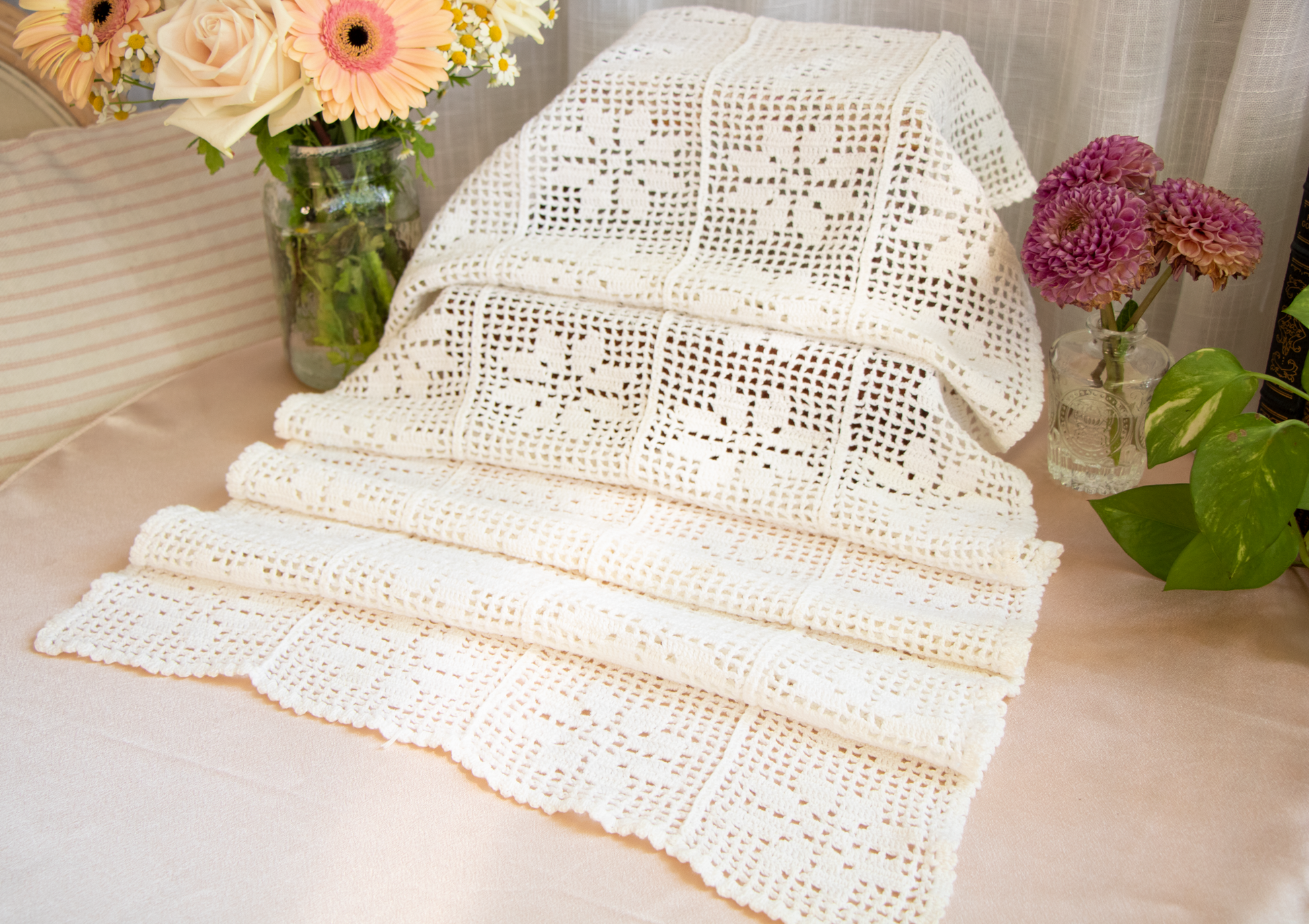 This table runner is a handcrafted crochet piece in soft ivory. Made up of repeating square motifs, each block features a charming floral-inspired pattern with openwork that gives it an airy, lacy feel. The squares are seamlessly joined together, creating a continuous design framed by a delicate scalloped edge.