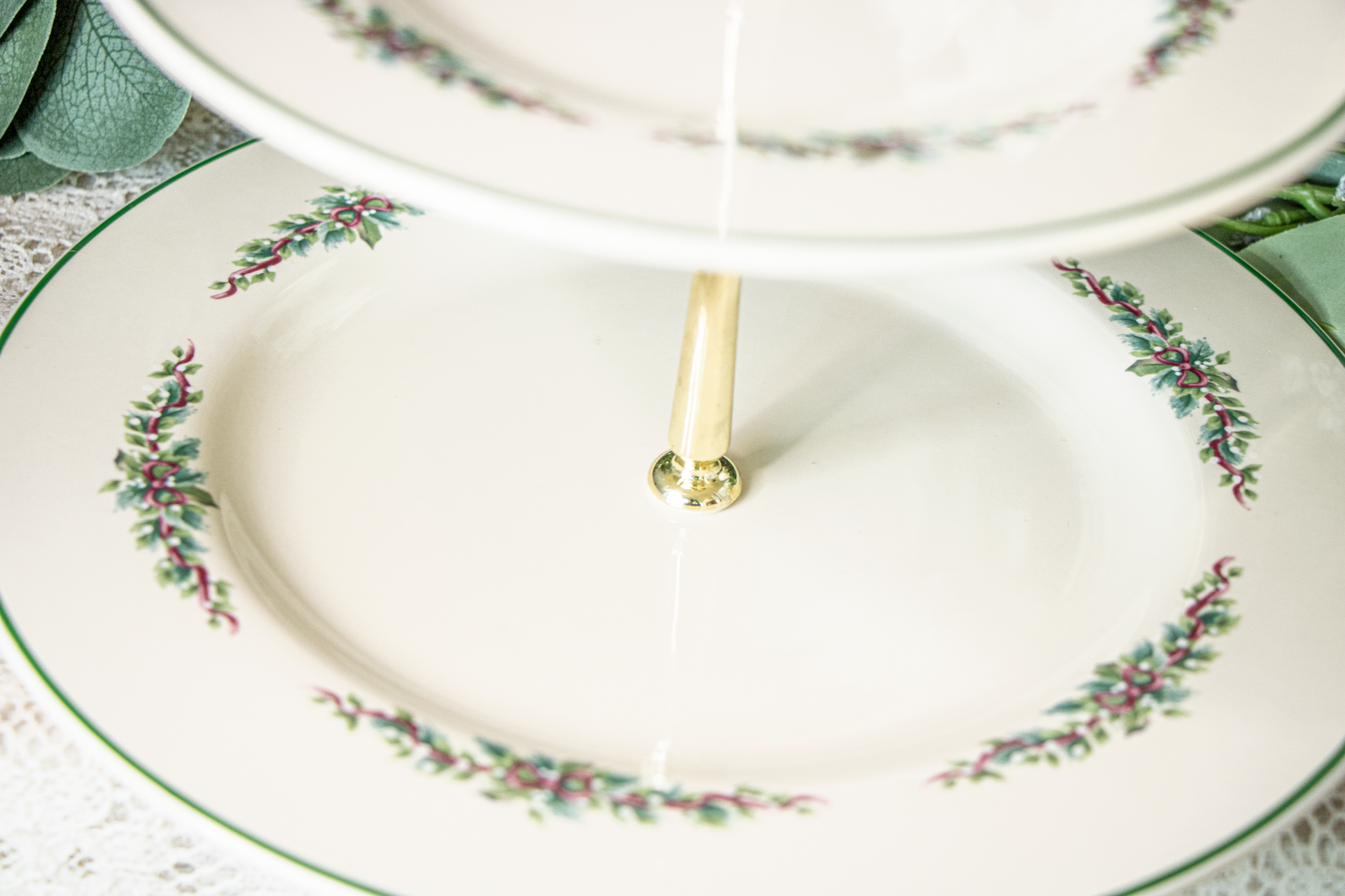 The plates are paired with a bright gold-tone metal center post, creating an elegant tiered display perfect for desserts, finger foods, or holiday centerpieces. Whether you're hosting a cozy Christmas tea or building out your vintage holiday serveware, this charming stand brings warmth and tradition to any setting.
