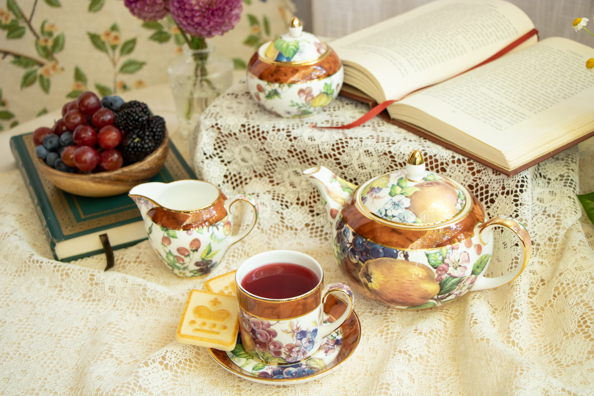 Celebrate timeless English charm with this exquisite vintage Rococo Fine Bone China demitasse tea set, hand-decorated in England. Each of the five dainty pieces is adorned with a lush cascade of vivid fruits and delicate blossoms, framed by warm woodgrain accents and gleaming gold trim. The artistry captures the essence of a summer orchard in bloom — a touch of countryside romance preserved in porcelain.