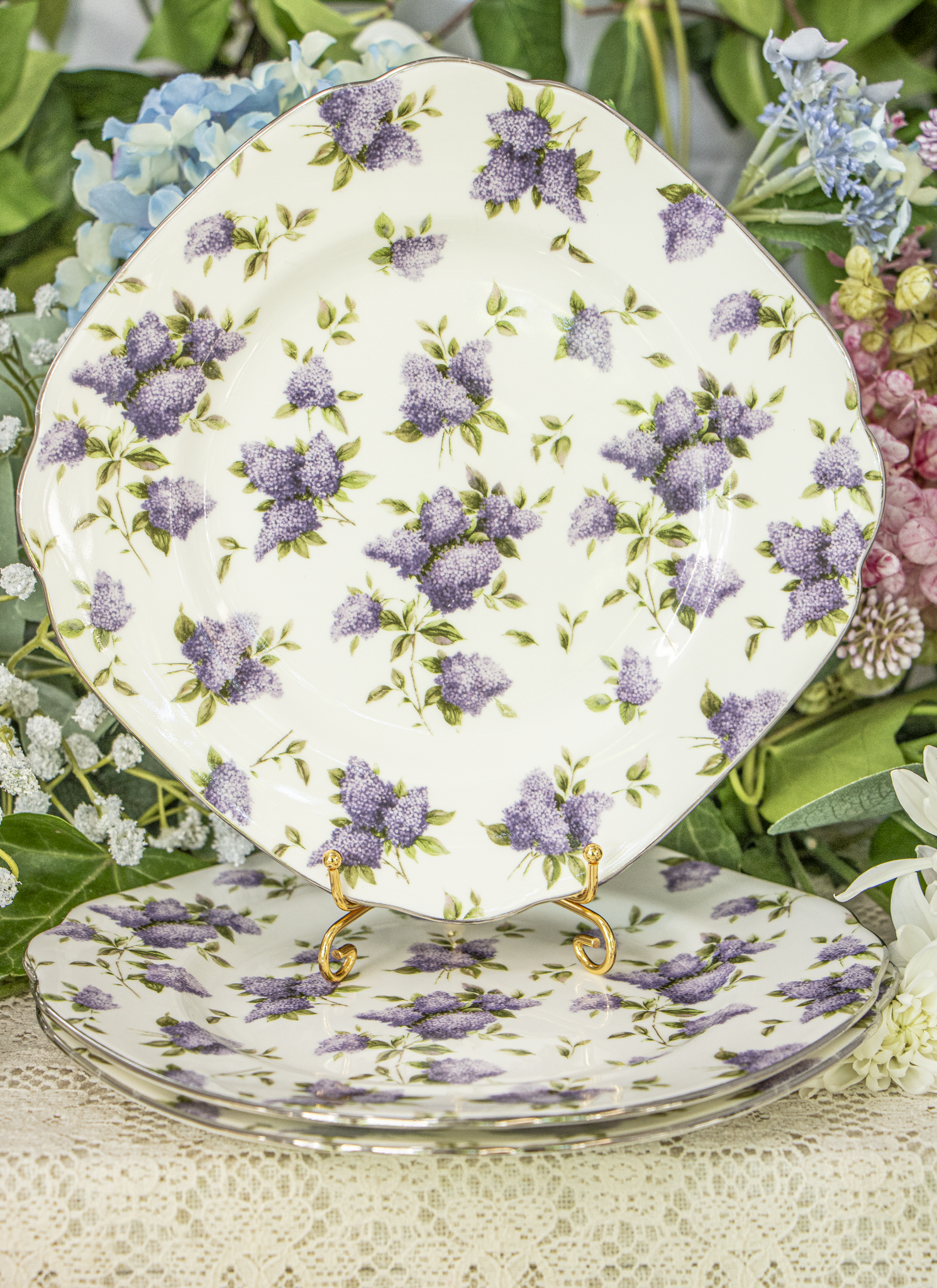 Bring timeless English elegance to your table with this exquisite set of 3 Royal Albert “Lilac Lane Platinum” plates. The “Lilac Lane Platinum” pattern features delicate clusters of purple lilacs and soft green foliage, subtly framed by a refined platinum-trimmed scalloped edge. Crafted in England from high-quality bone china, these pieces were produced between 2001–2009, and are now discontinued and moderately collectible.