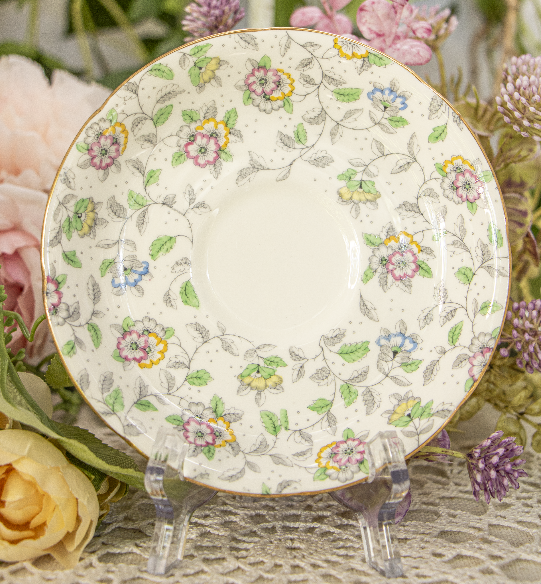 This exquisite Royal Grafton bone china teacup and saucer set features a delicate floral pattern in soft shades of pink, yellow, blue, and green, accented with fine grey vines. Both pieces are richly detailed with hand-applied gold trim along the rims, base, and handle.