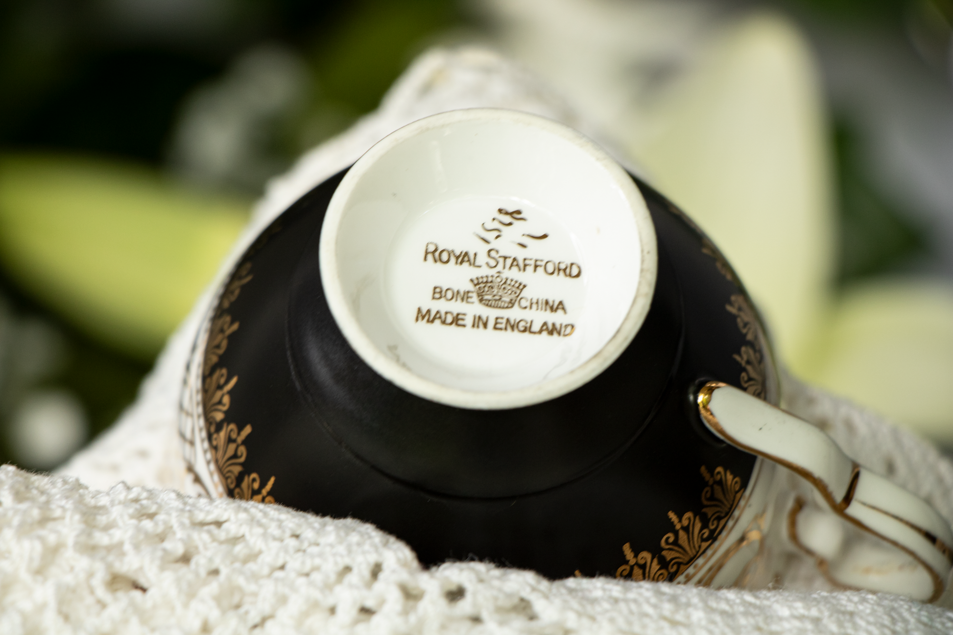 Royal Stafford Bone China Teacup and Saucer — Pattern 1528 — Matte Black with Gold Filigree — 1950s–1960s