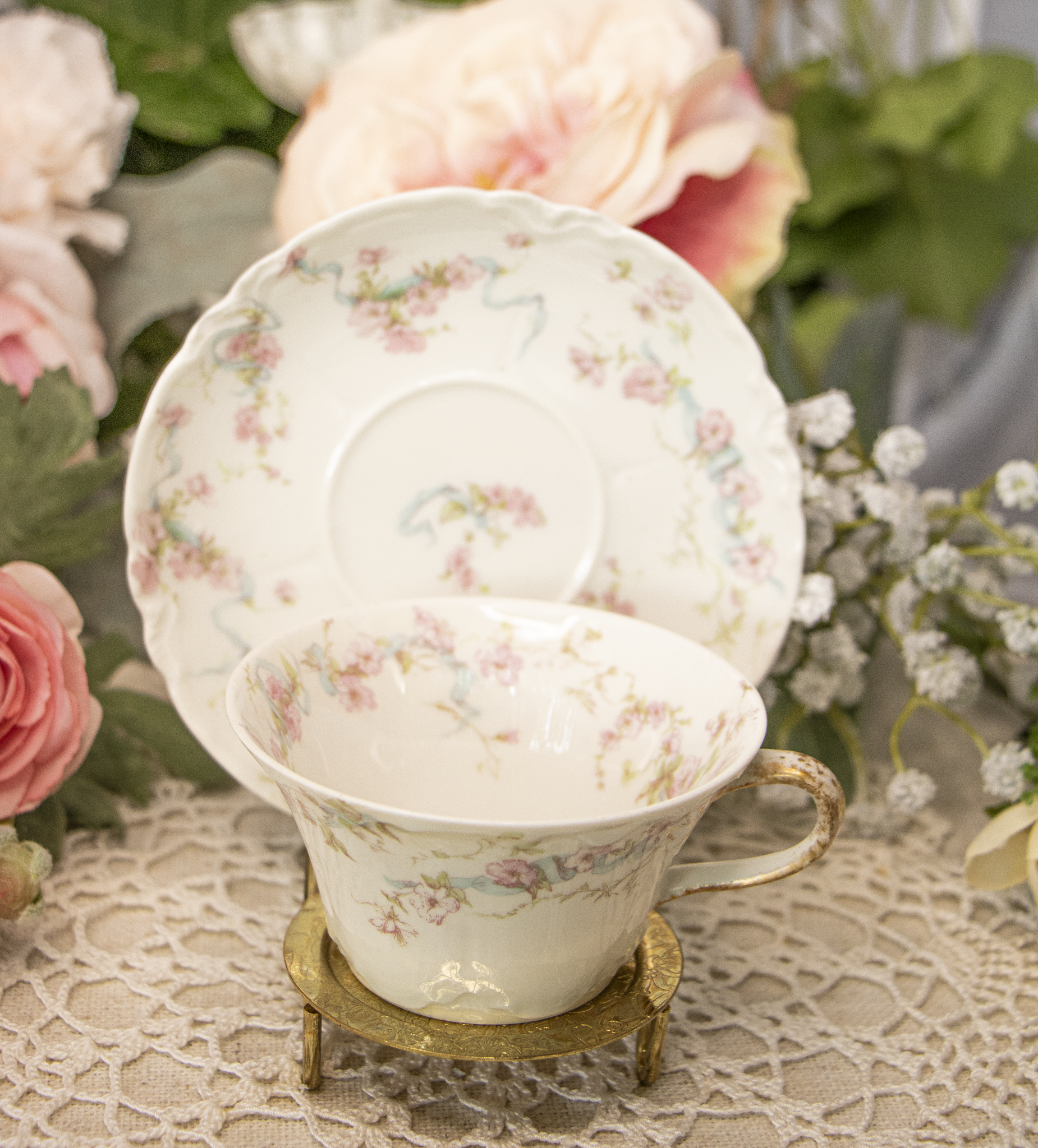 Theodore Haviland Limoges France – Dainty Teacup and Saucer – Pink Floral with Blue Ribbon & Gold Trim (c. 1900–1915)