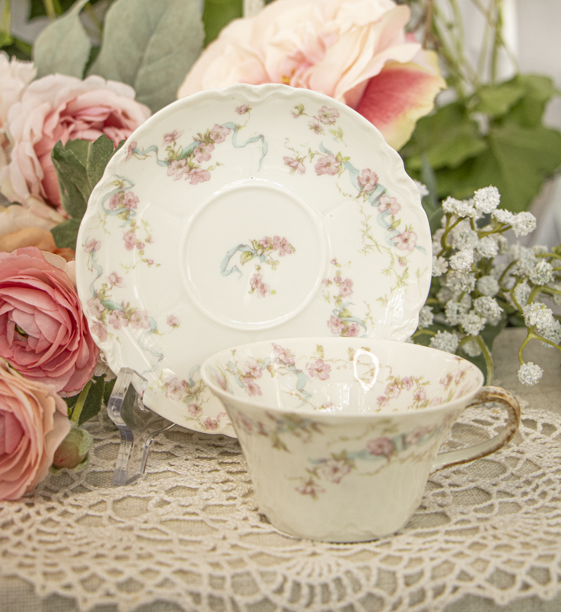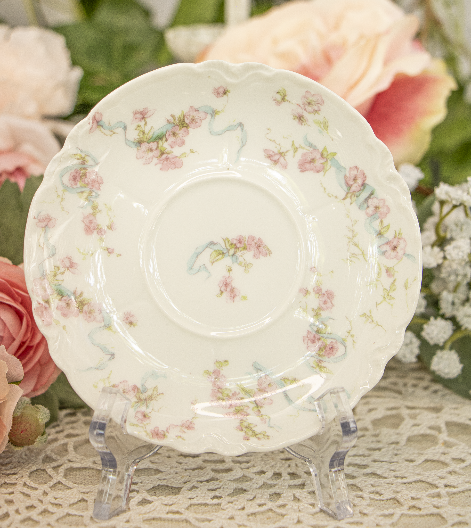 This exquisite antique teacup and saucer set by Theodore Haviland is a true treasure from Limoges, France, dating to the early 1900s. Crafted over 110 years ago, it features a delicate garland of soft pink roses tied with graceful blue ribbons, all accented by hand-applied gold trim along the scalloped edge and handle. Made from fine Limoges porcelain, this dainty set captures the timeless elegance and refined artistry of French design.