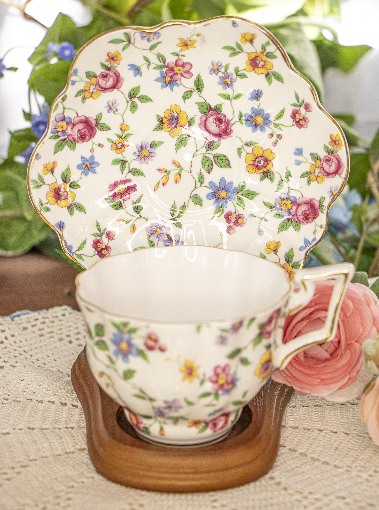 Crafted from fine bone china, this set features a vibrant multicolor floral design with delicate gold trim along the gently scalloped edges. The unique squared handle and charming floral pattern make it a standout piece for display or tea service.