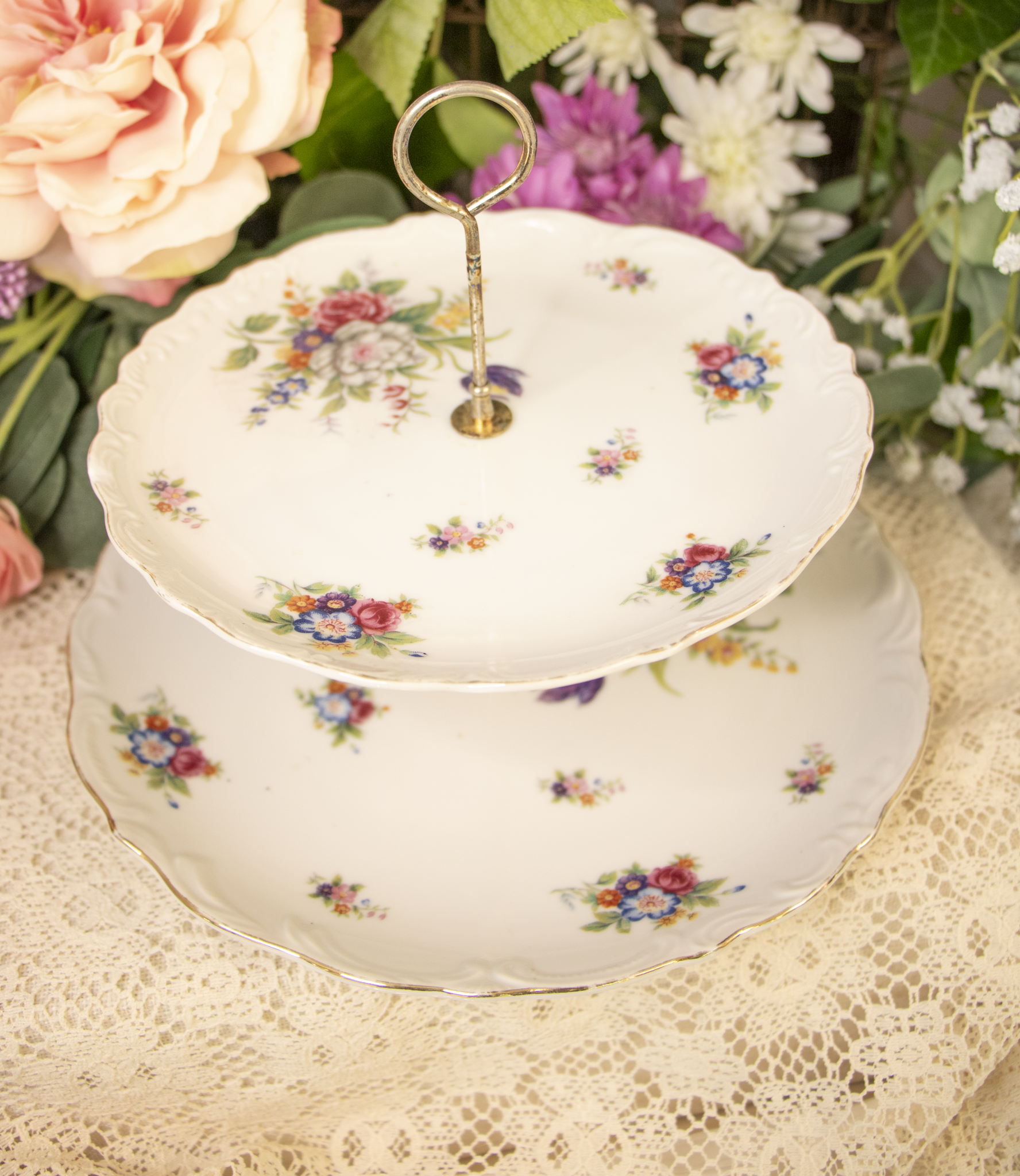 This charming vintage two-tier serving tray features beautifully scalloped porcelain plates adorned with vibrant floral motifs in pink, purple, blue, and green. A classic loop handle with a warm metallic finish connects the tiers, adding both elegance and functionality.