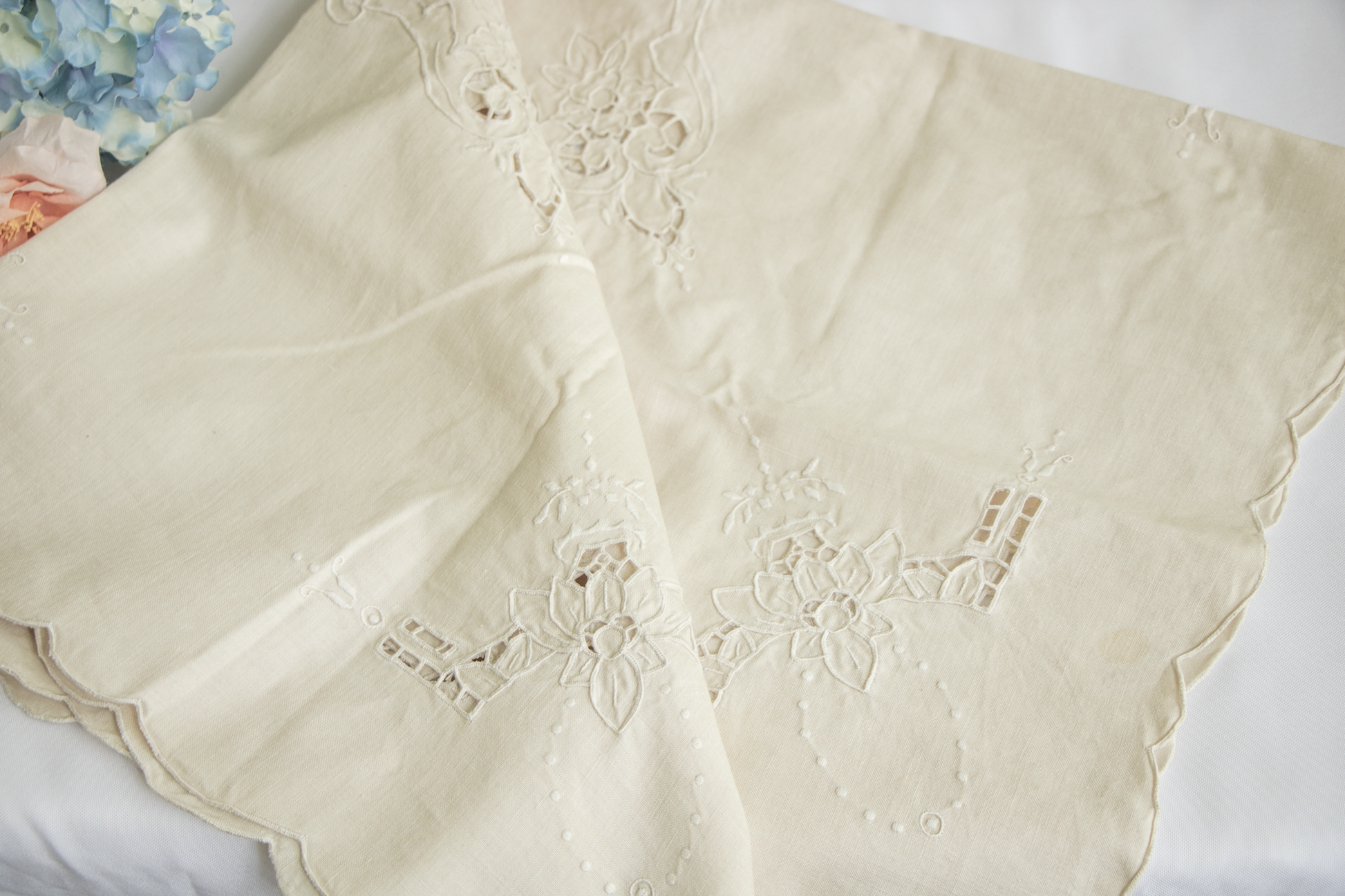 This elegant vintage beige table topper features intricate cutwork and satin stitch embroidery, showcasing a floral motif with geometric accents. Crafted on fine linen, the textile has a soft, smooth hand and a refined drape—hallmarks of mid-century craftsmanship.