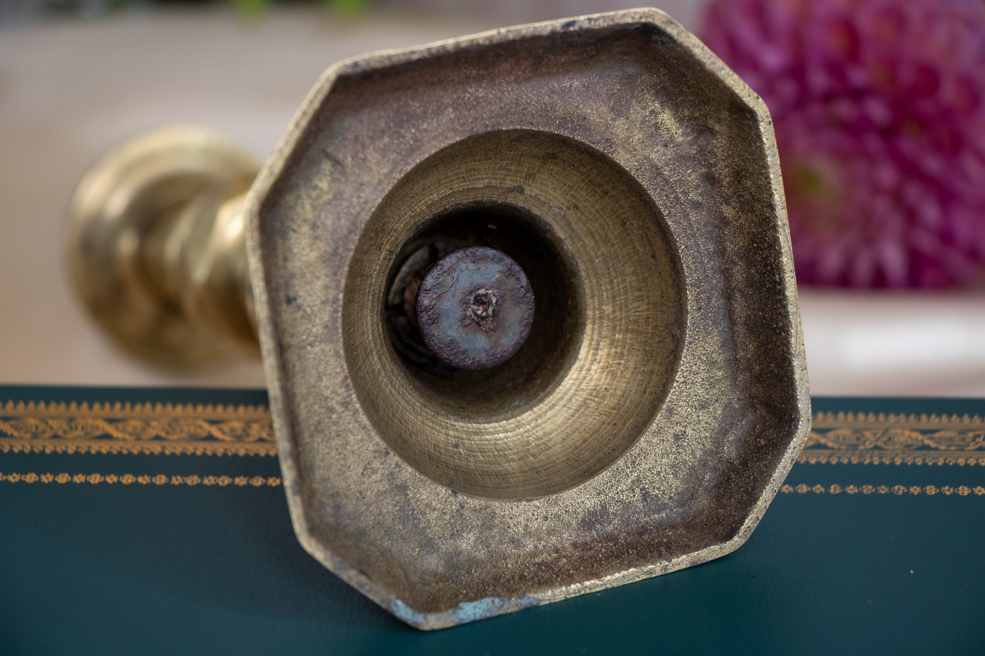 This pair of candlesticks features a classic octagonal base and columnar stem design. Likely dating from the late 1800s to early 1900s, these solid brass candle holders are ideal for antique collectors, home decorators, or those looking to incorporate old-world style into modern interiors.