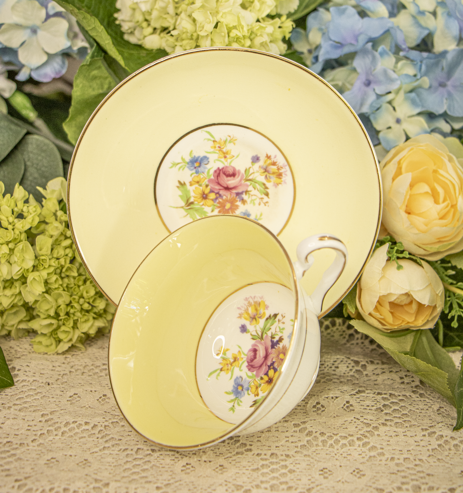 Rosina Bone China Teacup & Saucer – Yellow Rim with Floral Center – Made in England